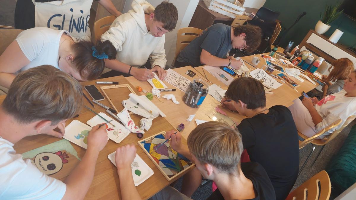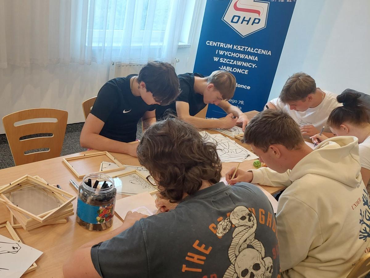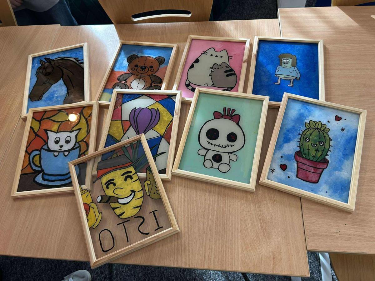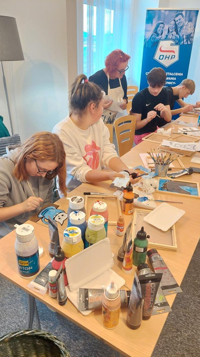 To już kolejne spotkanie z lokalną artystką – panią Elżbietą  Kowalczyk. Tym razem nasi podopieczni malowali na szkle. Pierwszym etapem pracy było wybranie obrazka i odmalowanie go za pomocą markera. Niektórzy z naszych wychowanków stworzyli własne projekty, inni korzystali z gotowych wzorów. Następnie w  ruch poszły pędzle i farby, by finalnie zapełnić całą szklaną przestrzeń i umieścić swoja pracę w ramce. Dzisiejsze zajęcia były świetną okazją na wykorzystywanie procesu twórczego, młodzież  mogła wyrazić swoje emocje, myśli czy doświadczenia. Proces arteterapii służy lepszemu zrozumieniu siebie, rozładowaniu napięcia, budowaniu samoświadomości i poczucia sprawstwa. Nie ocenia się wartości artystycznej dzieł, a sztuka staje się narzędziem do wspierania zdrowia psychicznego i fizycznego, a także rozwoju osobistego, znajdując zastosowanie w terapii różnych schorzeń, niepełnosprawności, uzależnień oraz jako forma rekreacji.