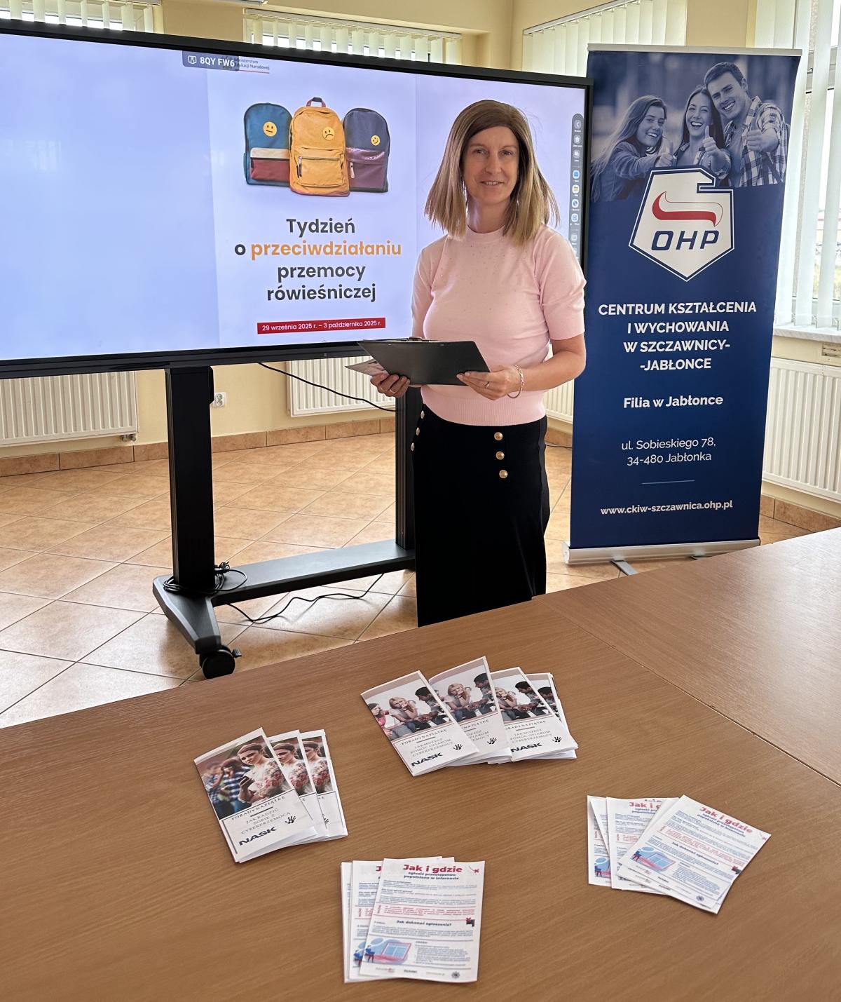 W Centrum Kształcenia i Wychowania OHP w Szczawnicy-Jabłonce trwa Tydzień Przeciwdziałania Przemocy Rówieśniczej. Już drugi dzień młodzież bierze udział w zajęciach, których celem jest zwiększenie świadomości na temat przemocy oraz kształtowanie postaw opartych na empatii i wzajemnym szacunku. Zajęcia prowadzone są przez pedagoga i obejmują zarówno część warsztatową, jak i dyskusyjną. Młodzież rozmawia o różnych formach przemocy, sposobach jej rozpoznawania oraz właściwego reagowania – zarówno w roli ofiary, jak i świadka. Spotkania sprzyjają otwartości i refleksji, a uczestnicy chętnie dzielą się swoimi spostrzeżeniami. Istotnym elementem działań są również filmy edukacyjne, które poruszają tematykę agresji i przemocy w relacjach rówieśniczych. Pomagają one w zrozumieniu, jak niewłaściwe zachowania wpływają na innych oraz jakie skutki mogą wywoływać. W całej placówce pojawiły się plakaty i ulotki informacyjne, które wspierają przekaz zajęć i przypominają, że nie warto być obojętnym. Materiały te mają na celu nie tylko edukację, ale także zachęcenie młodzieży do reakcji w sytuacjach przemocy. Dzięki zaangażowaniu uczestników, atmosfera podczas zajęć sprzyja rozmowie i budowaniu świadomości społecznej. To ważny krok w kierunku tworzenia bezpieczniejszego i bardziej wspierającego środowiska dla wszystkich.