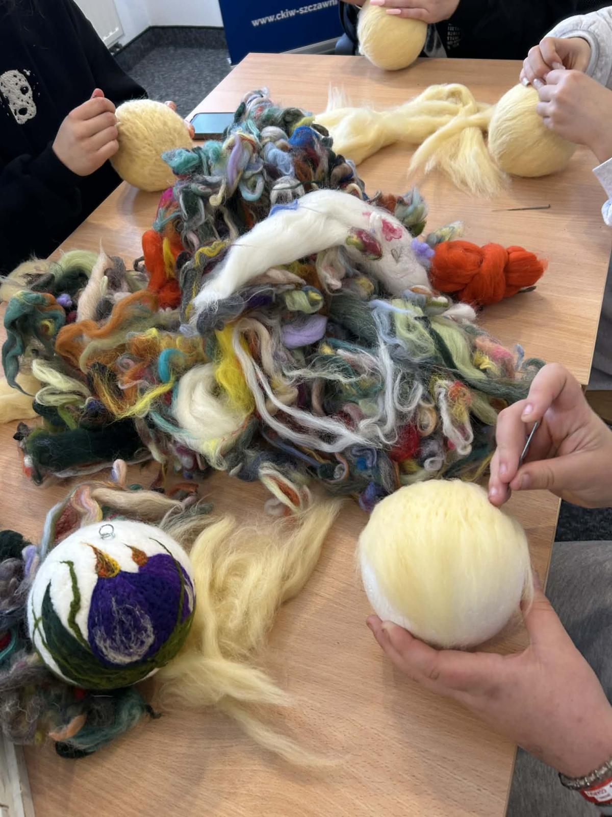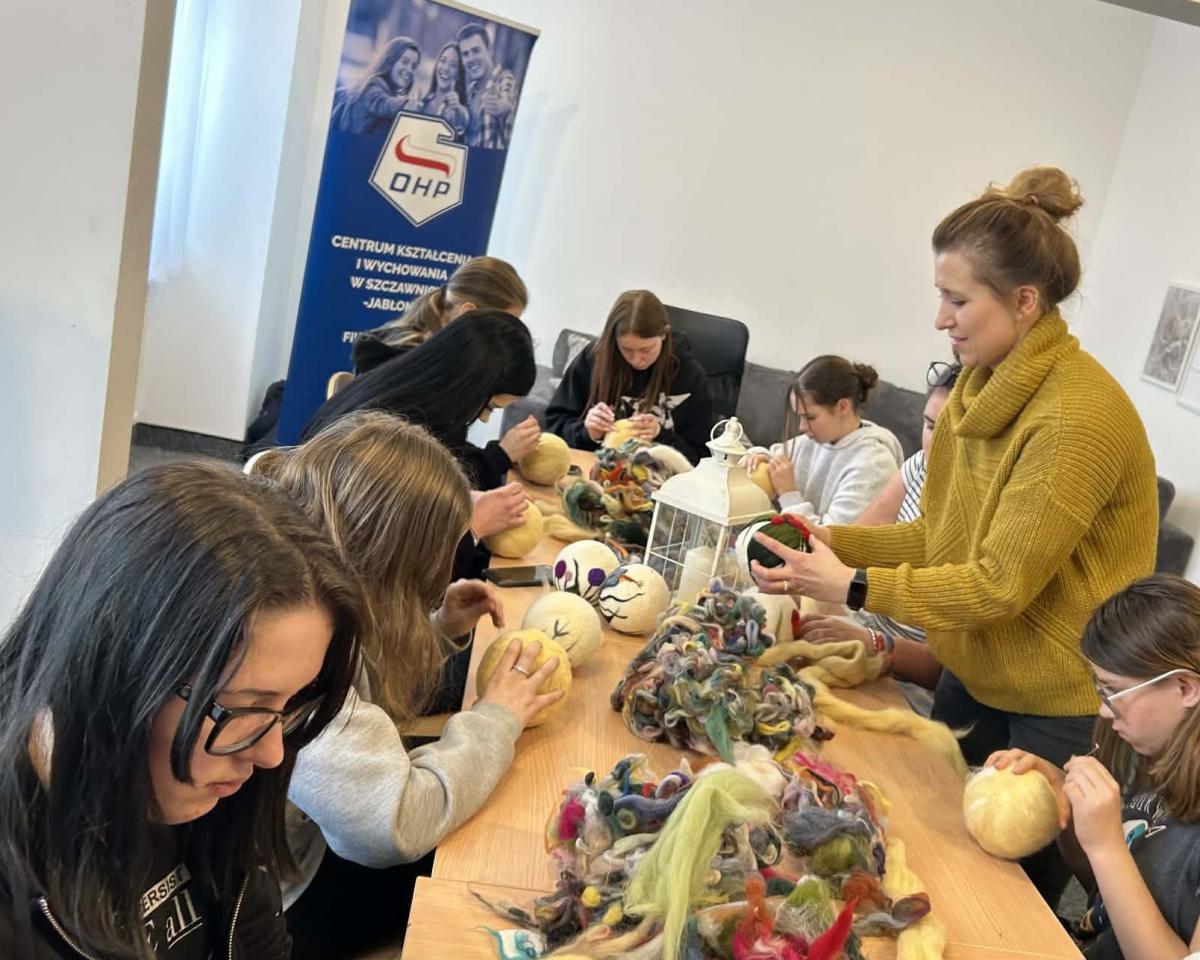 W dniu 4 grudnia 2025 roku po raz kolejny gościliśmy w Centrum Kształcenia i Wychowania OHP w Szczawnicy-Jabłonce panią Elżbietę Kowalczyk. Tym razem nasza młodzież na grupowych warsztatach z Arteterapii wykonała świąteczne bombki z filcu. Pani „Ewucha” opowiedziała zebranym o technice filcowania wełny na sucho, którą wykorzystano do wykonania dzisiejszych ozdób. Podopieczni stworzyli na styropianowych bombkach, przepiękne motywy świąteczne. Tak powstałe dzieła będą idealnym elementem dekoracyjnym na zbilżające się Święta Bożego Narodzenia.