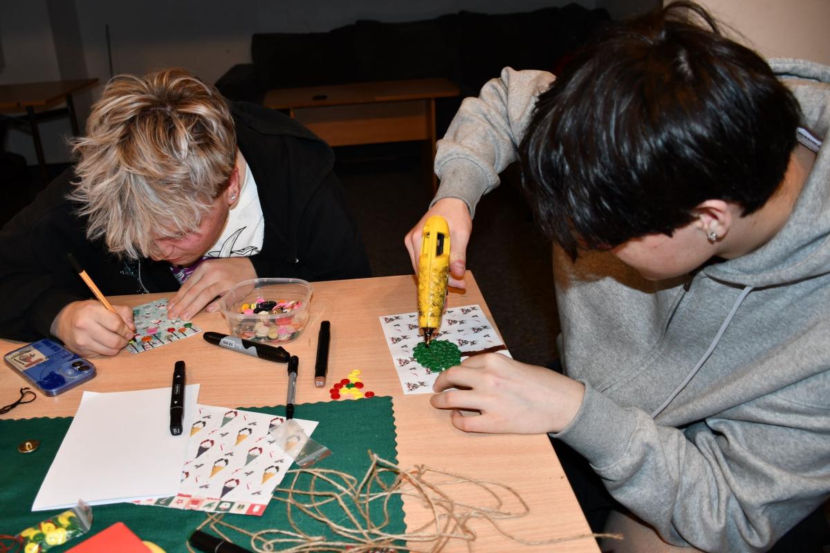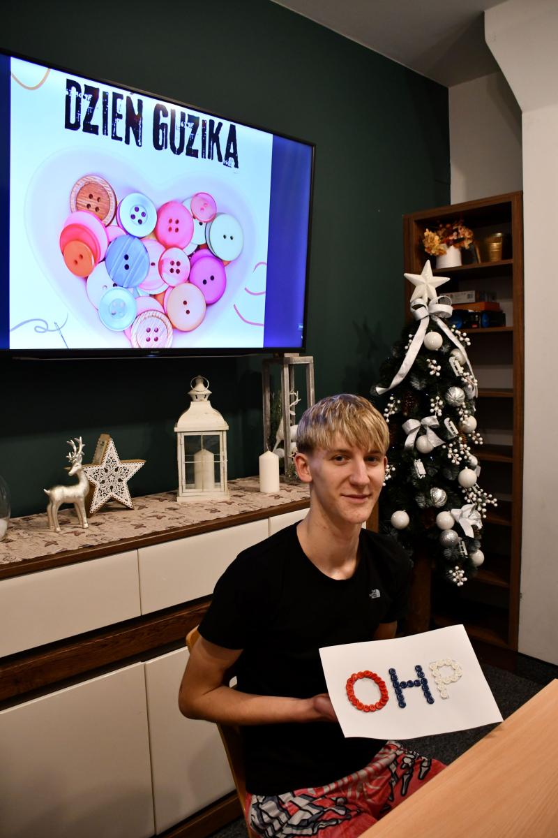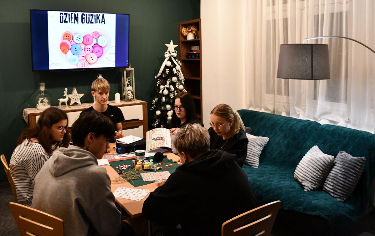 Podczas obchodów Dnia Guzika młodzież z CKiW OHP w Szczawnicy - Jabłonce wzięła udział w kreatywnych zajęciach plastyczno-technicznych, podczas których tworzyła wspólne prace z wykorzystaniem kolorowych guzików. Uczestnicy pracowali w małych grupach, planując kompozycję, dobierając guziki i wspólnie decydując o kształcie swojej pracy.