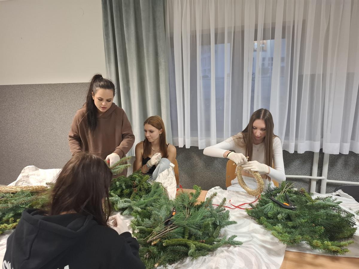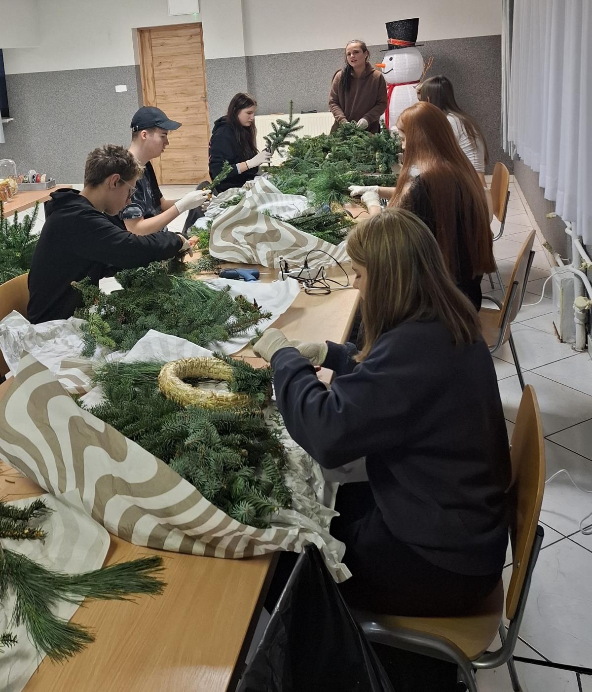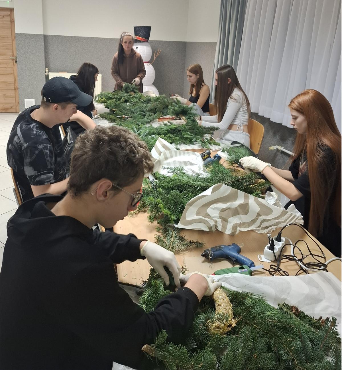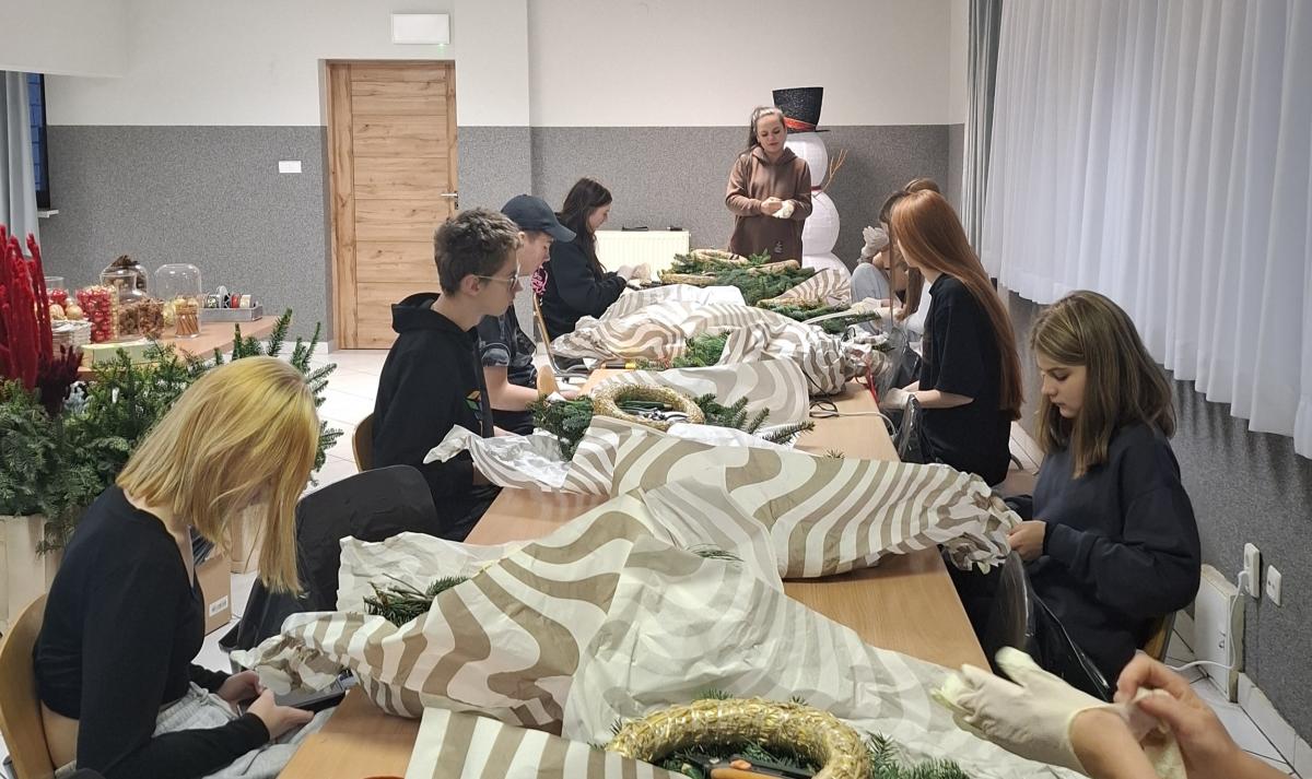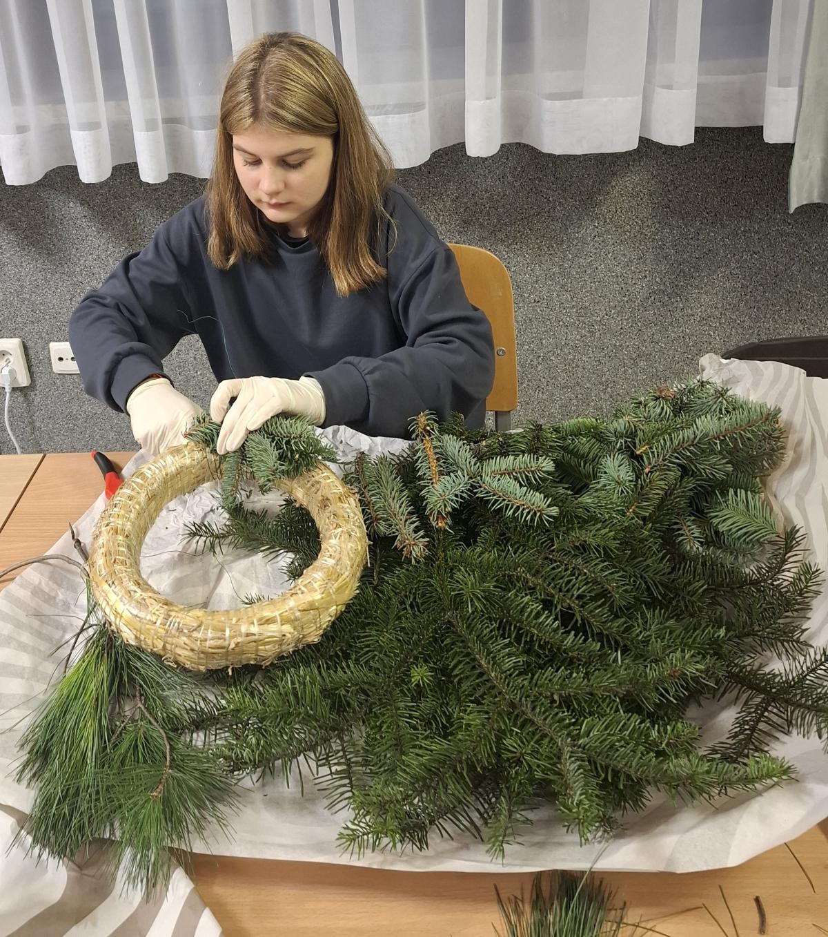 Na początku warsztatów młodzież zapoznała się z materiałami niezbędnymi do wykonania wianków – gałązkami iglastymi, szyszkami, suszonymi owocami, wstążkami oraz świątecznymi ozdobami. Panie florystki krok po kroku tłumaczyły, jak tworzyć harmonijne kompozycje, dobierać kolory oraz dbać o estetykę i trwałość dekoracji.