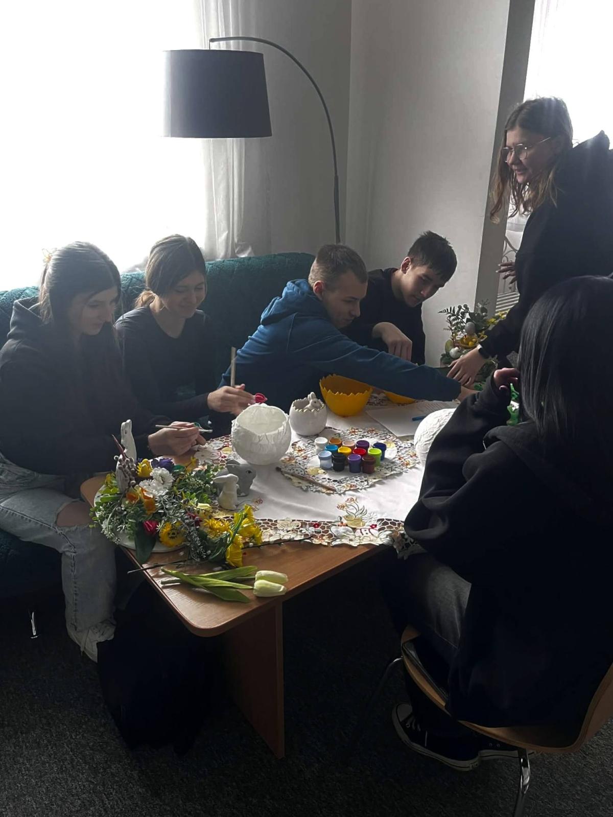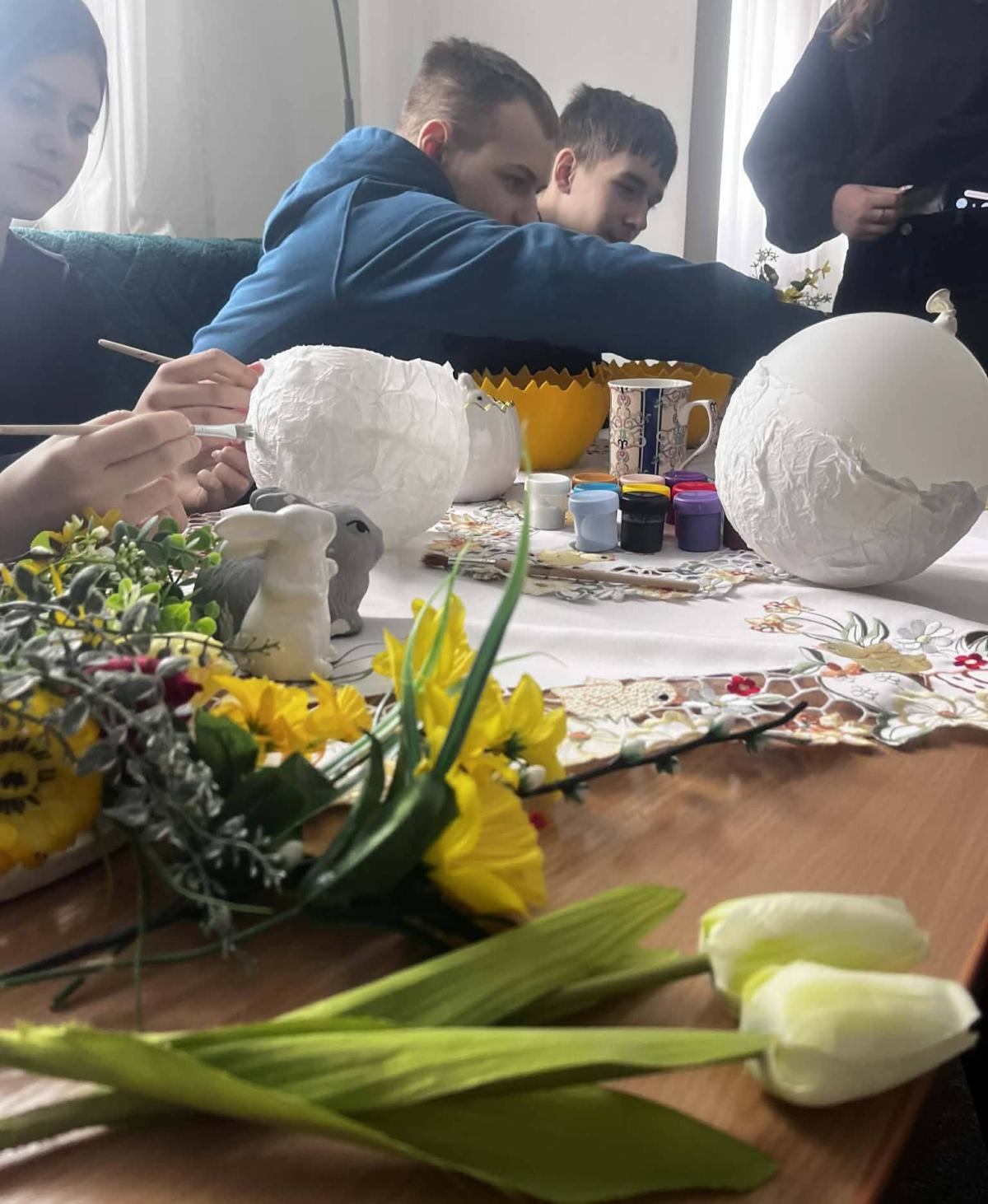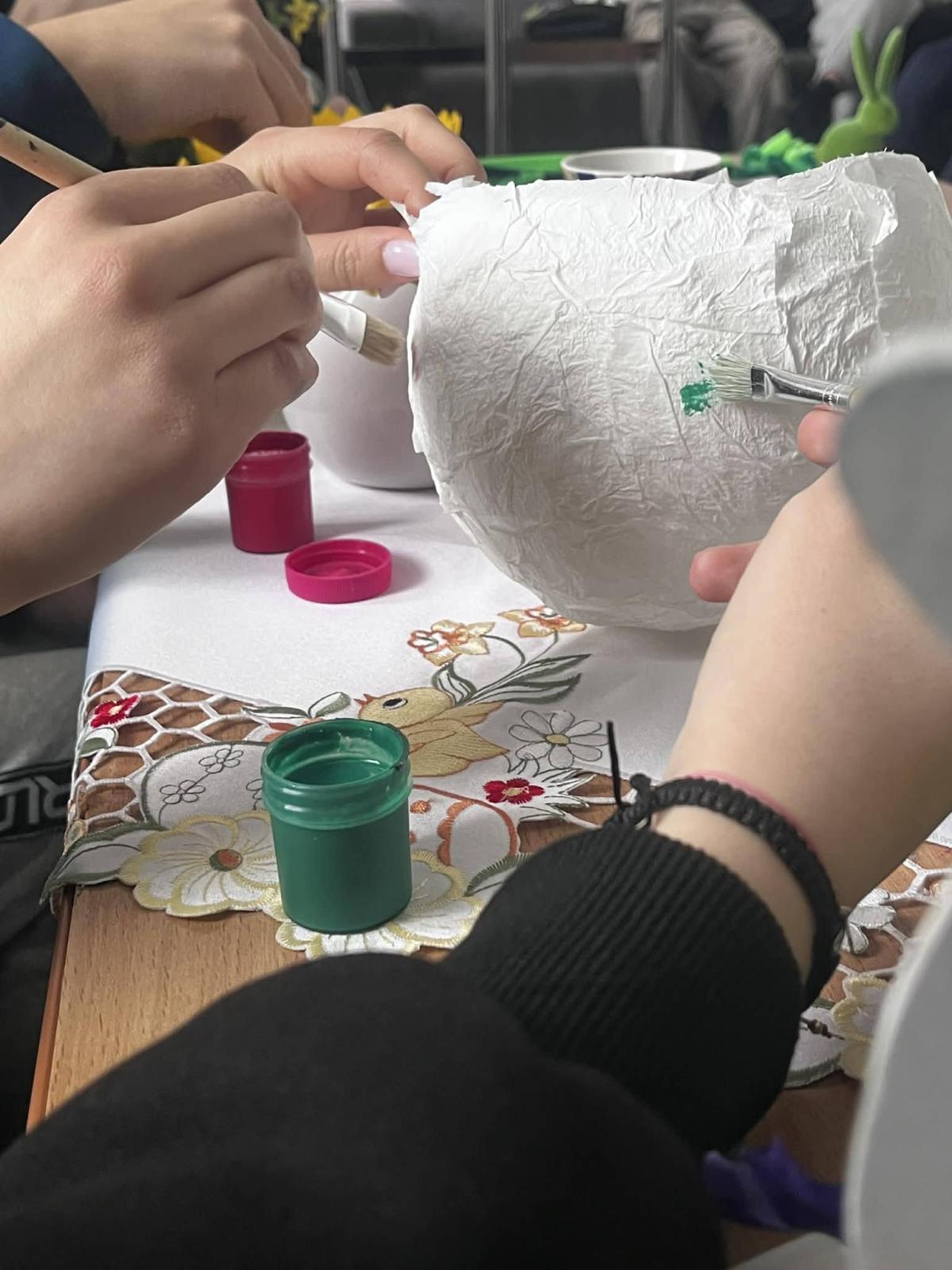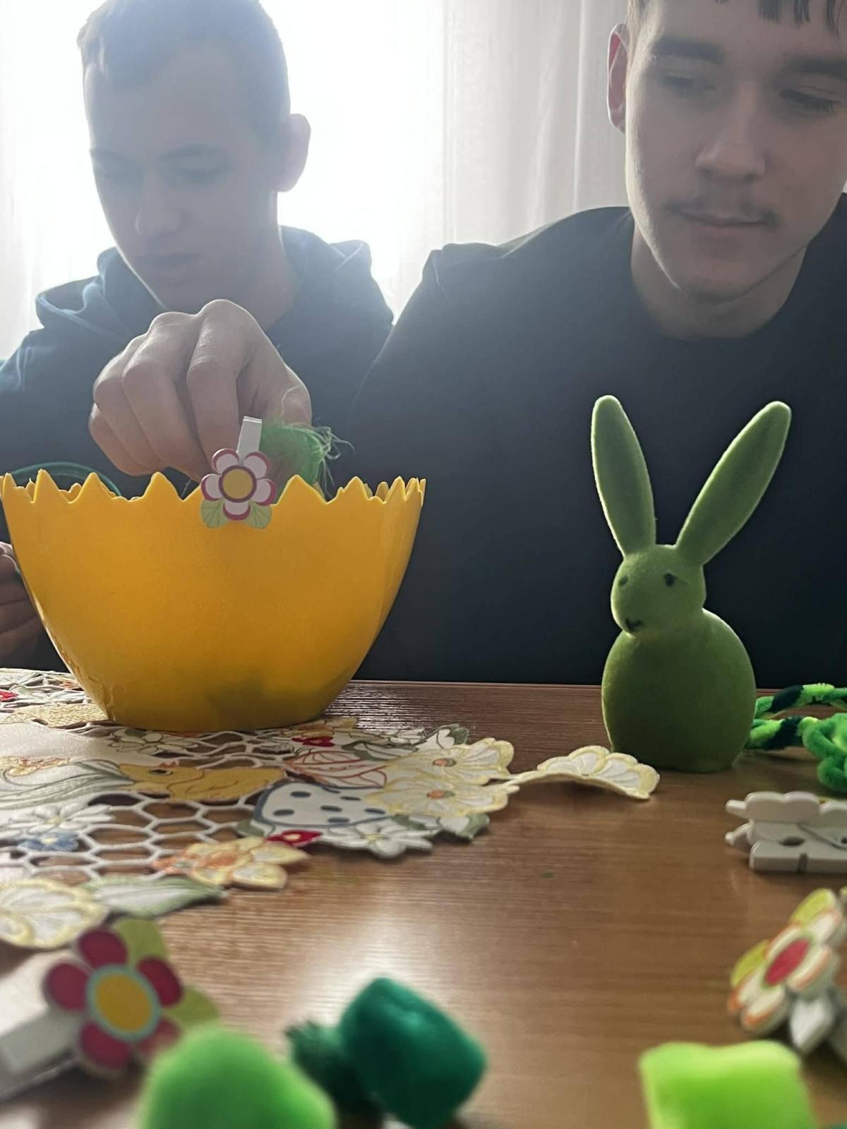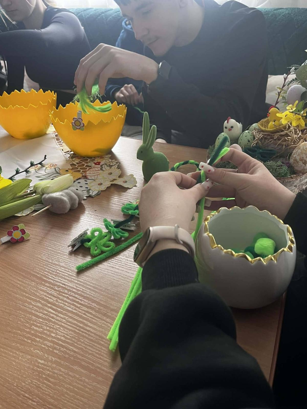 Wychowankowie mieli możliwość pracy z różnorodnymi materiałami, takimi jak: kolorowe wstążki, wydmuszki, sztuczne kwiaty czy ozdobne figurki kurczaczków i zajączków. Każdy mógł zaprojektować własny stroik według indywidualnego pomysłu, co sprzyjało rozwijaniu wyobraźni i poczucia estetyki. Tworzenie dekoracji odbywało się w miłej i twórczej atmosferze. Młodzież chętnie dzieliła się pomysłami oraz pomagała sobie nawzajem, ucząc się współpracy i cierpliwości.