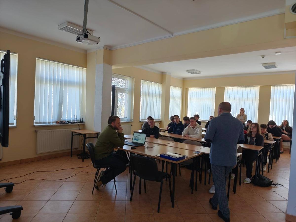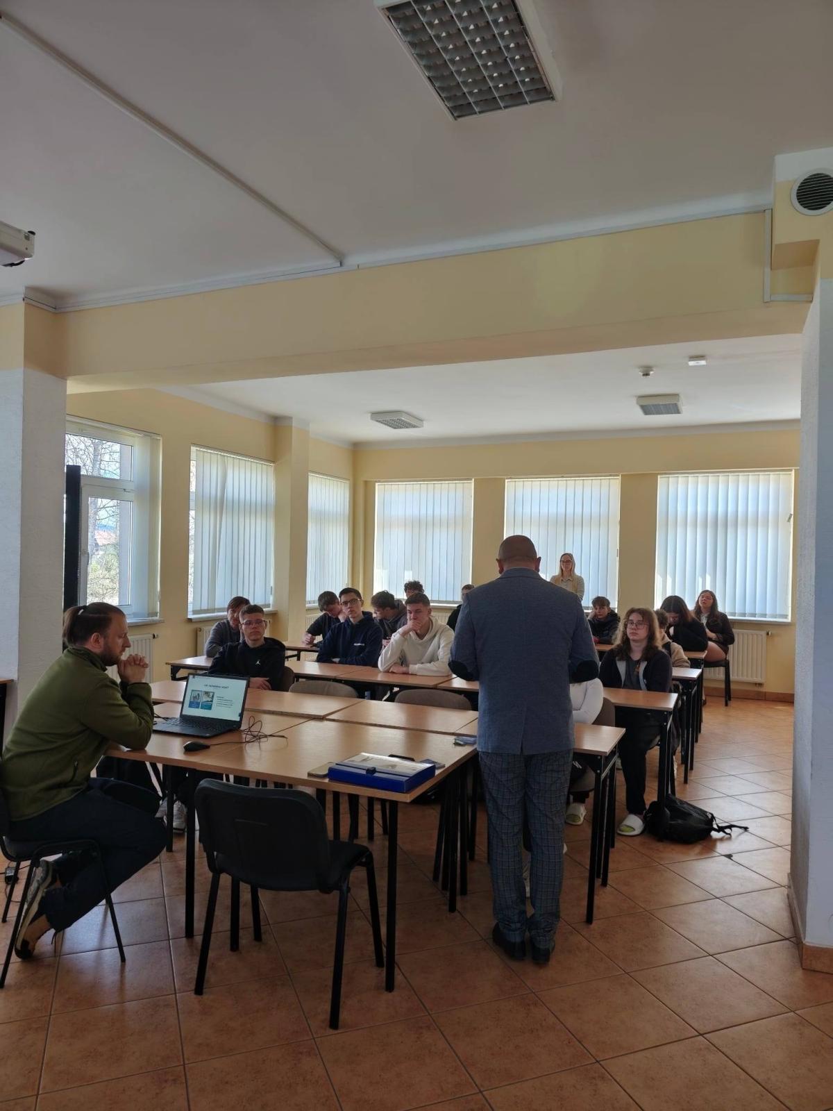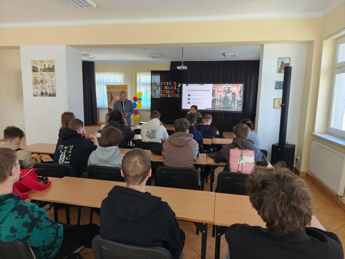 Uczniowie mieli okazję zapoznać się z możliwościami dalszej nauki, jakie oferuje Szkoła Branżowa II Stopnia. Doradca zawodowy przedstawił także formy kształcenia w ramach kwalifikacyjnych kursów zawodowych, podkreślając ich elastyczność i dostosowanie do potrzeb współczesnego rynku pracy. Podczas spotkania szczególny nacisk położono na znaczenie kontynuowania edukacji, zdobywania nowych kwalifikacji oraz rozwijania kompetencji, które zwiększają szanse na rynku pracy. W trakcie spotkania zwrócono uwagę na to, jak istotny jest rozwój osobisty.